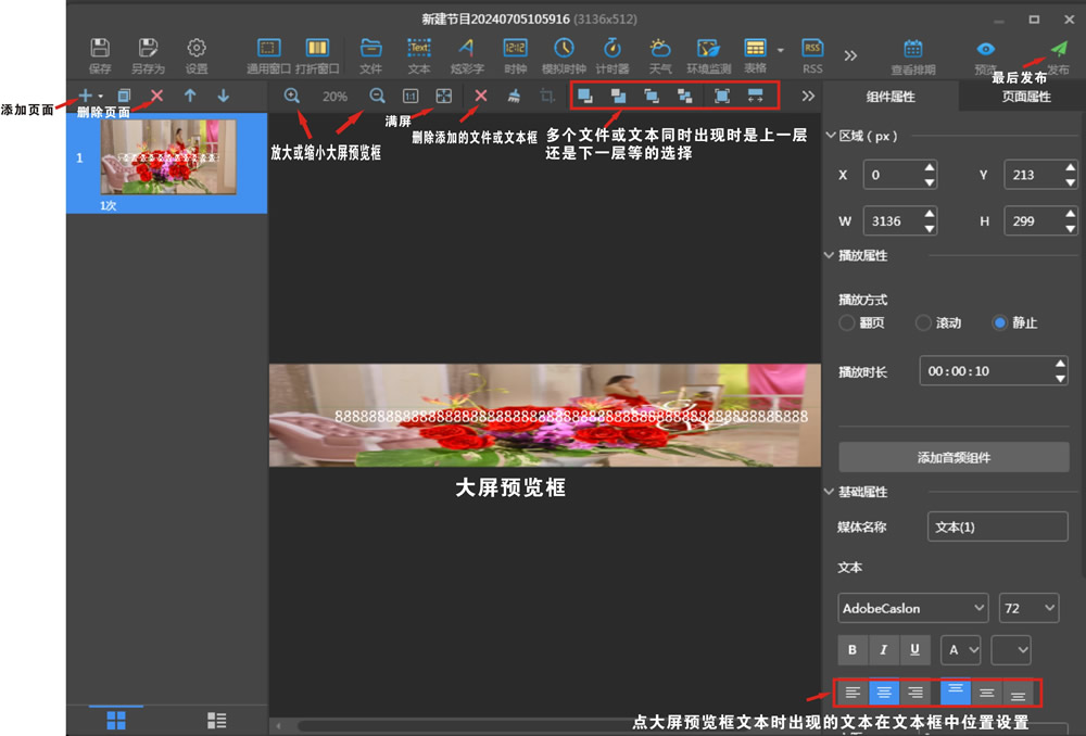 四、編輯節(jié)目:首先在終端管理界面,用鼠標(biāo)點(diǎn)擊終端名稱(chēng),再在節(jié)目管理界面,點(diǎn)新建,設(shè)置大屏寬高點(diǎn)數(shù)(不是尺寸),如果先前有節(jié)目,只需勾選后點(diǎn)上面編輯就行。圖片和視頻點(diǎn)擊上面文件,點(diǎn)擊后直接從電腦里選擇文件,文字選擇文本。每一次選擇下面大屏預(yù)覽框上較左上角就有個(gè)顯示框,這個(gè)顯示框比較小,可以在右上角設(shè)置大小或者用鼠標(biāo)拉大,也可以用鼠標(biāo)拖著擺放在屏的任意位置。文本需要雙擊大屏預(yù)覽左上角文本框后進(jìn)行編輯。不然找不到編輯文字的地方。大屏預(yù)覽框上面有很多設(shè)置功能可以選擇。